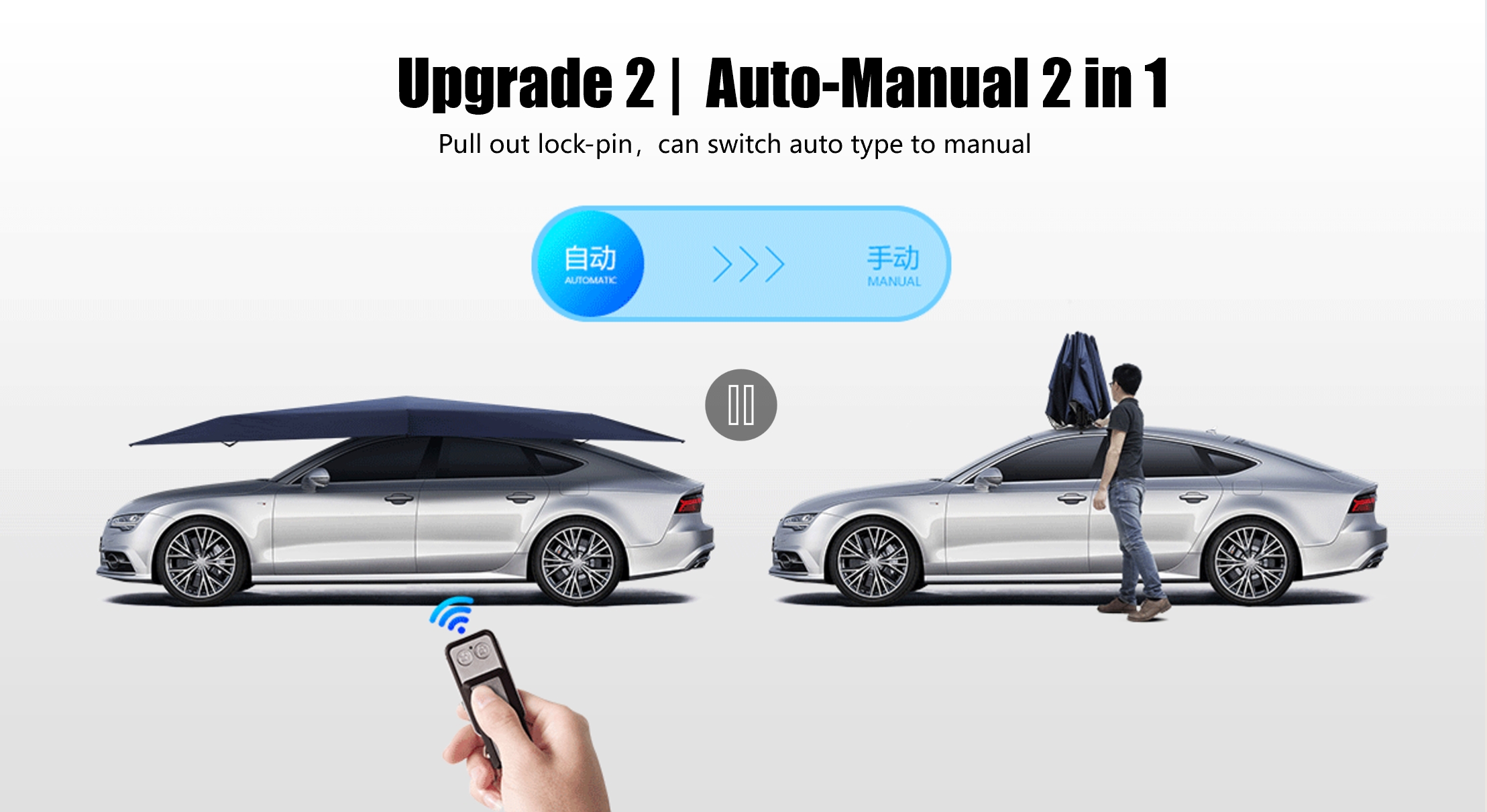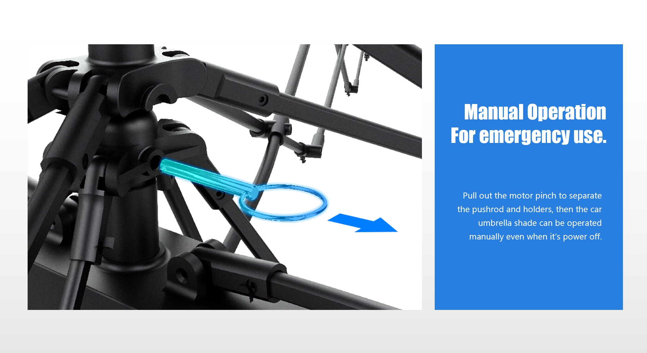 تمثل مظلة الشمس الكهربائية من الجيل الثاني التي يتم التحكم فيها عن بعد ترقية شاملة عن سابقتها. فهو يستخدم مواد أخف وزنًا ويزيد من مساحة التظليل دون المساس بأداء المحرك القوي، ويحافظ على ثبات الفتح والإغلاق باستخدام زر واحد.
