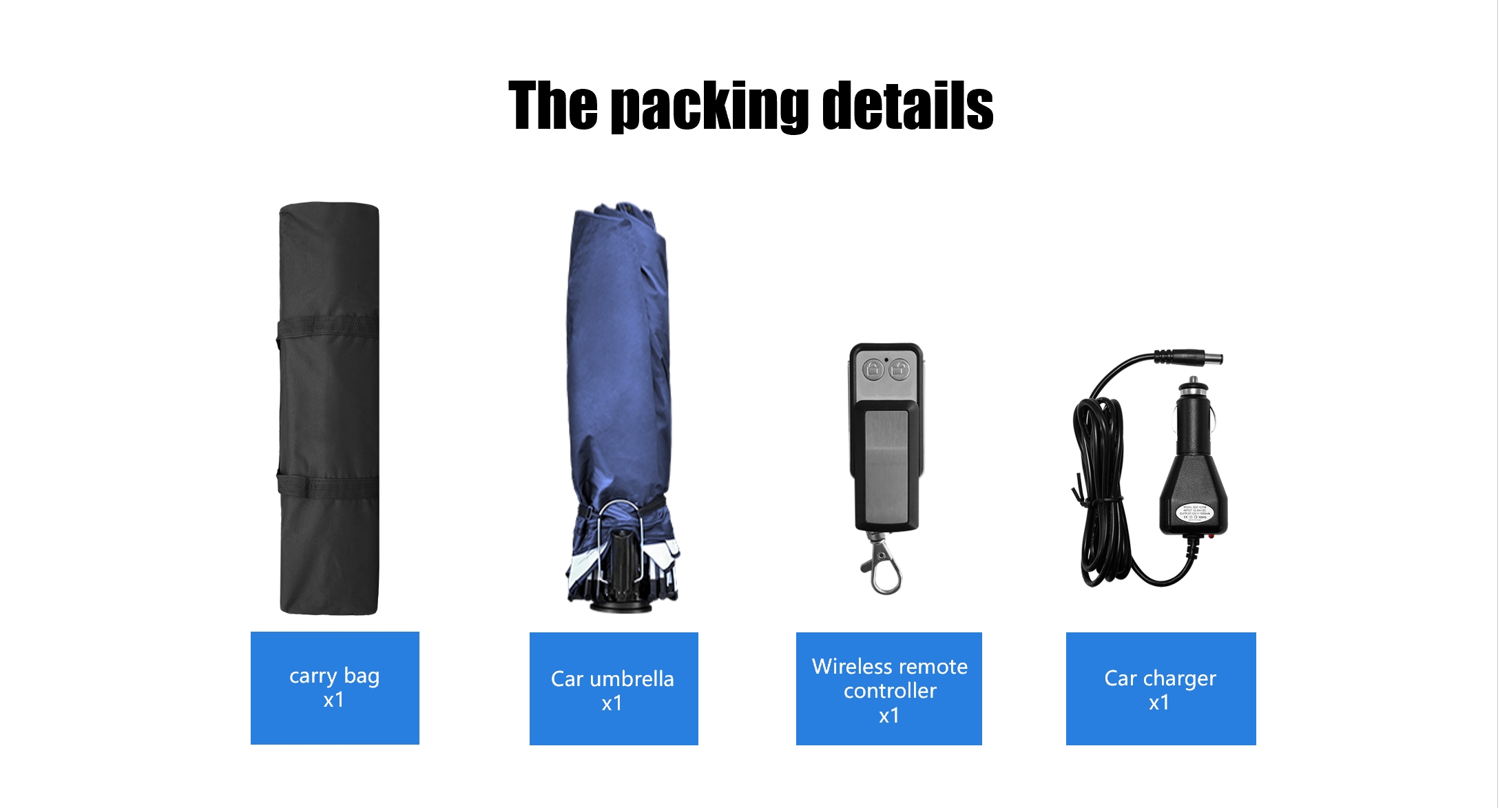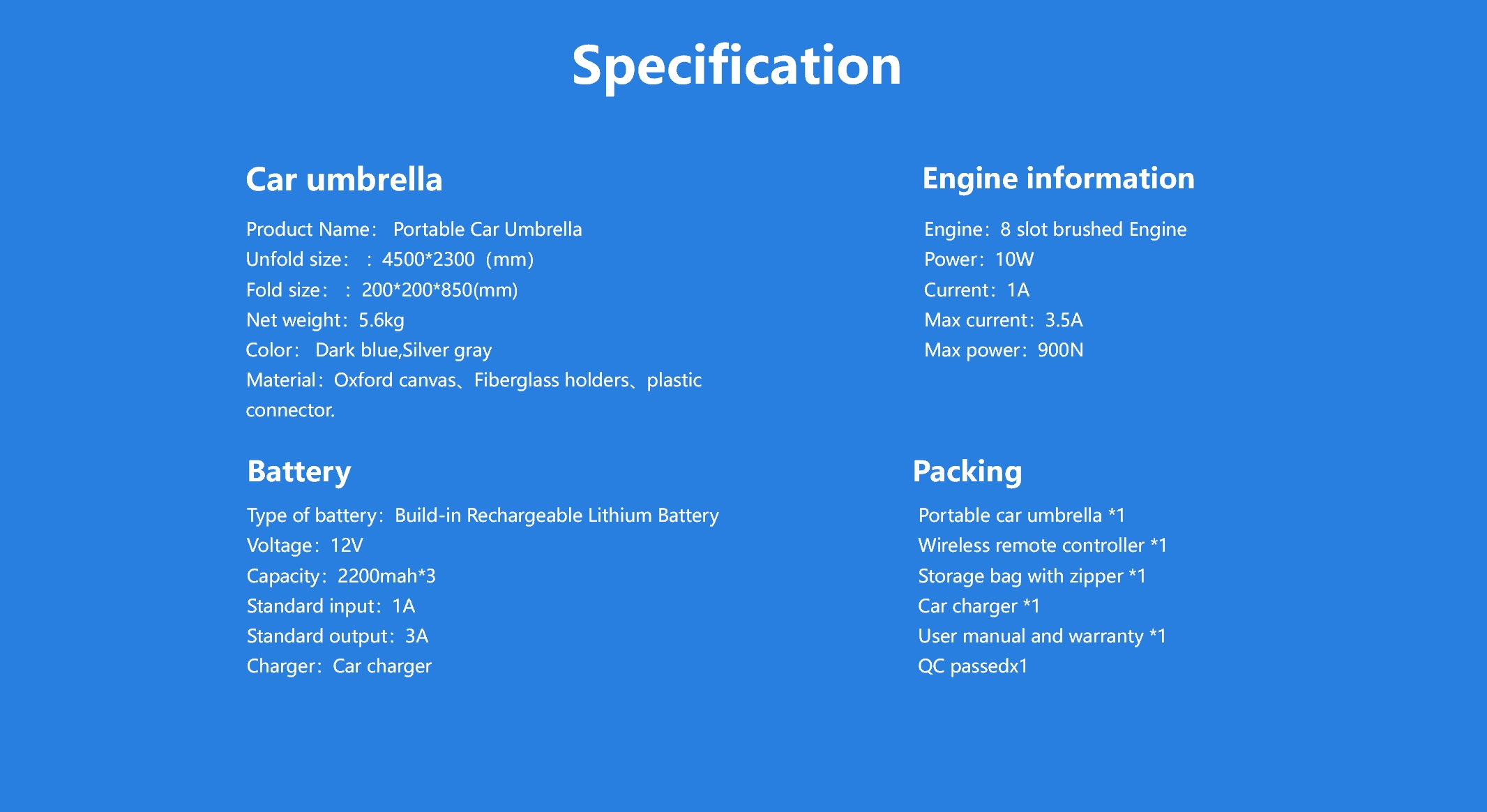 | المساعدون | مظلة سيارة محمولة × 1، حقيبة تخزين بسحاب ×1، دليل المستخدم وبطاقة الضمان X1. |