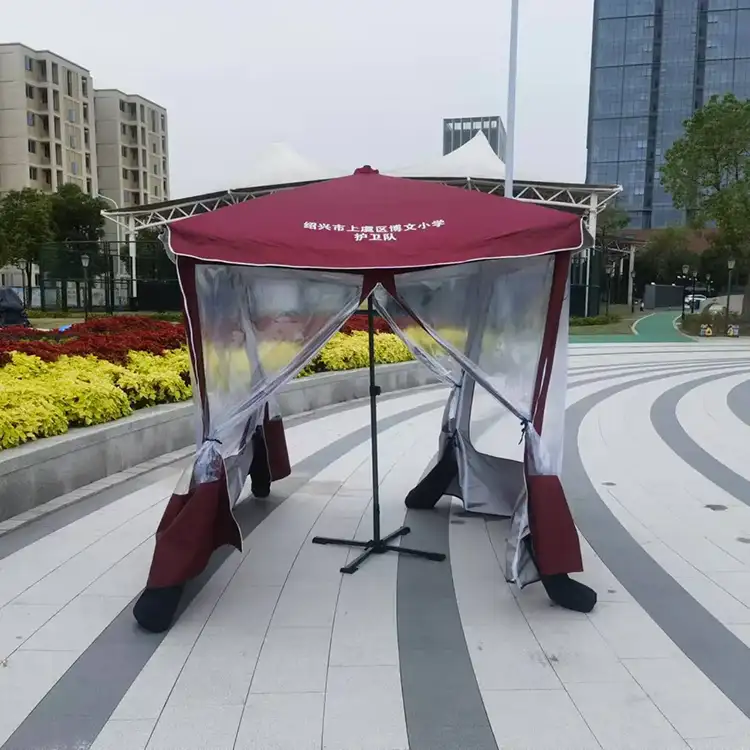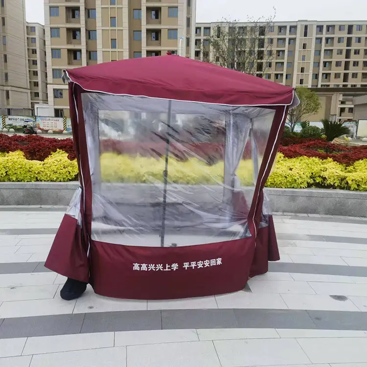 من المحتمل أن تكون السلامة أولوية، لذا يجب أن يكون الهيكل قويًا، وربما مع حماية من الأشعة فوق البنفسجية إذا كان أيضًا للشمس. أولاً، سقف من البوليستر أو البولي إيثيلين المقاوم للماء مع حماية للأشعة فوق البنفسجية، وعادةً ما نطبق قماش بوليستر 210T، وألواح جانبية شبكية اختيارية للتهوية ومقاومة الحشرات، وغالبًا ما يُرى هنا عمود الألياف الزجاجية.