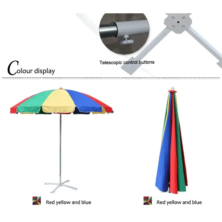 مظلة الشاطئ لمنع أشعة الشمس المباشرة على الشاطئ في المظلة الكبيرة. يعتمد تصميم مظلة الشاطئ على مظلة الفناء والتطور. ولكن الآن مع تطور انتشار النمط البسيط وصناعة الترفيه التجارية، تم استخدامه على نطاق واسع لمظلات الشاطئ على الشاطئ، الشكل الجميل، تأثير تظليل الشمس الفعال، أغراض الإعلان التجاري الخارجي غير المكلفة أكثر ملاءمة للترويج لعصره. مظلة الشاطئ مريحة للتحرك، وتركيب بسيط، ومنخفض التكلفة، ويمكن أن تكون مزايا إعلان الشعار.